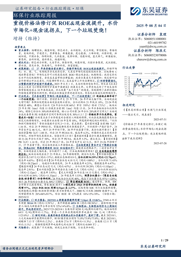 【东吴证券】【20250804】环保行业跟踪周报_重视价格法修订促ROE_现金流提升_水价市场化+现金流拐点_下一个垃圾焚烧-29页