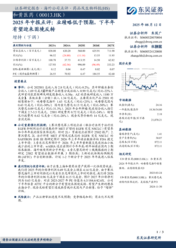 医药研发 和黄医药 财务预测 困境反转 业绩分析