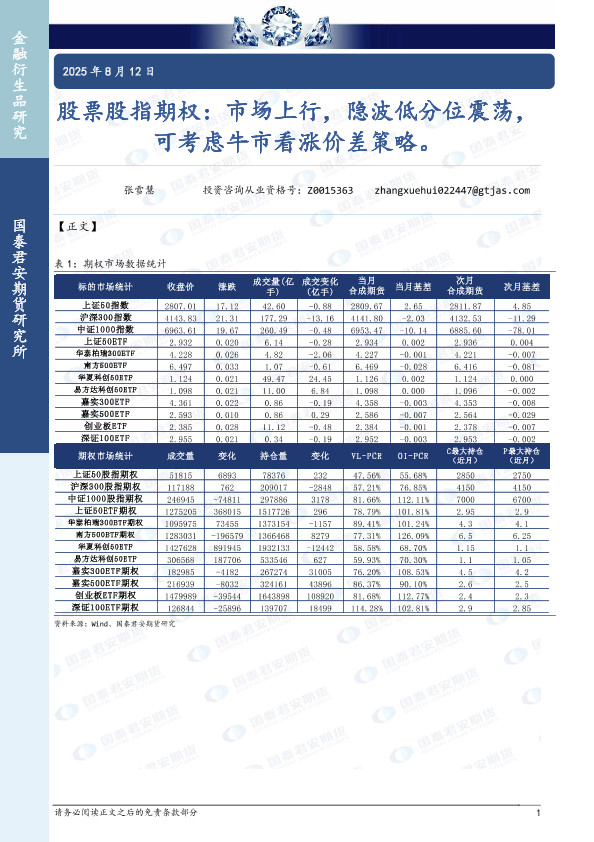 【国泰君安期货】【20250812】股票股指期权:市场上行,隐波低分位震荡,可考虑牛市看涨价差策略-15页