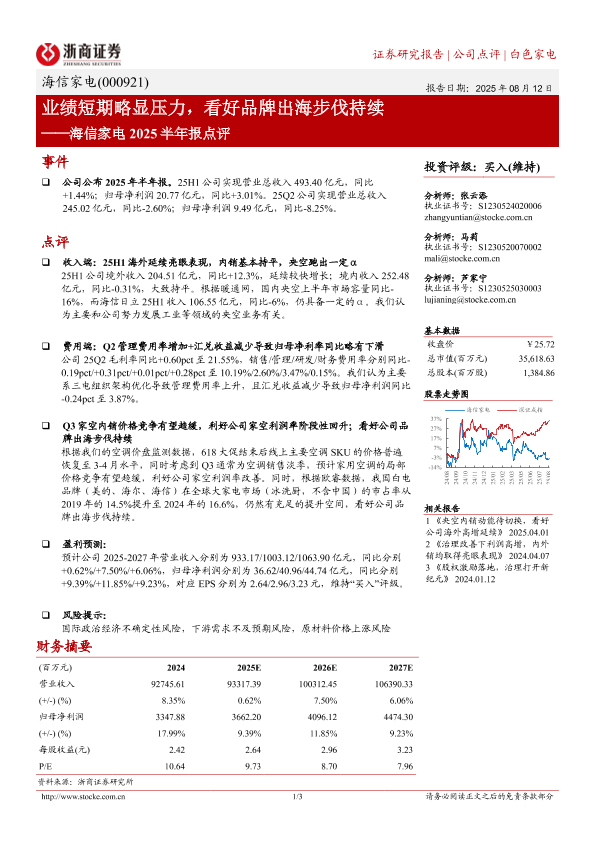 【浙商证券】【20250812】海信家电2025半年报点评_业绩短期略显压力_看好品牌出海步伐持续-3页