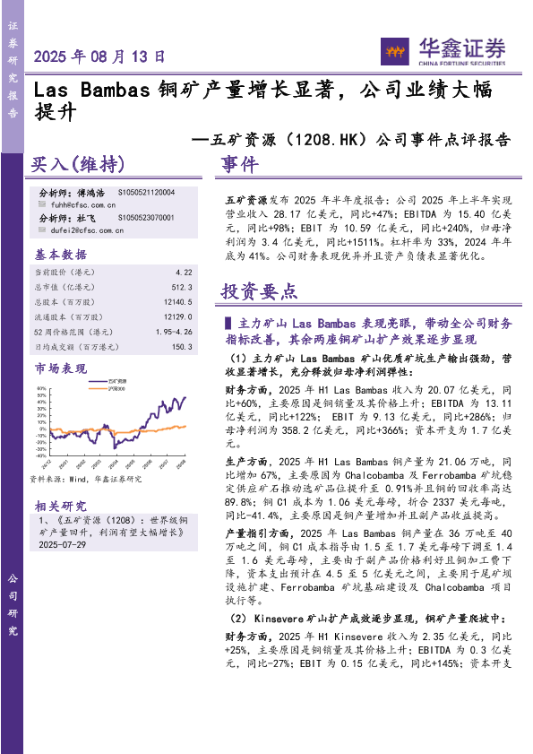 【华鑫证券】【20250813】五矿资源公司事件点评报告:Bambas铜矿产量增长显著,公司业绩大幅提升-6页