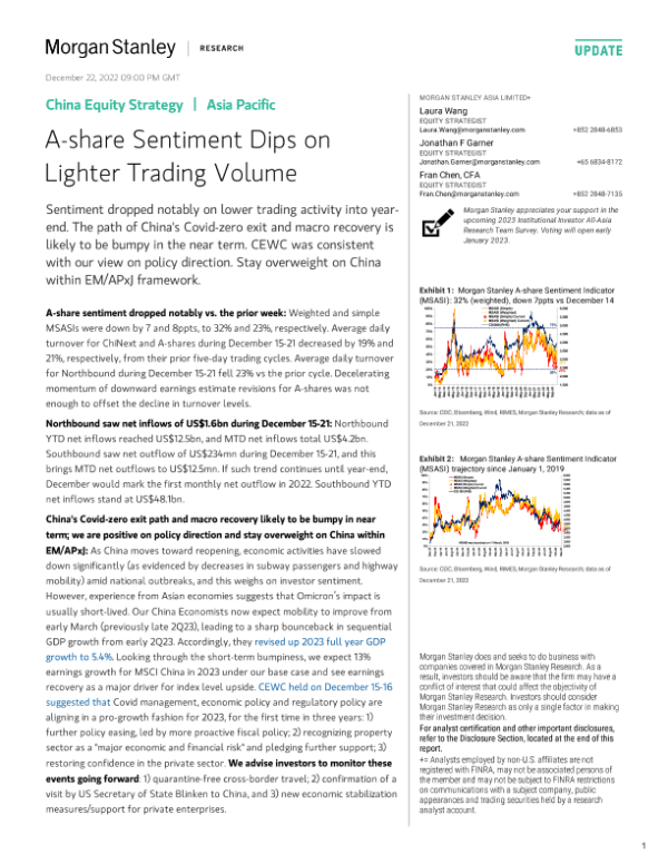 【Morgan Stanley】【20221222】China Equity Strategy A-share Sentiment Dips on Lighter Trading Volume-10页