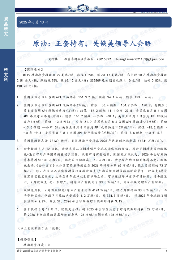 【国泰君安期货】【20250813】原油:正套持有,关俄美领导人会晤-3页