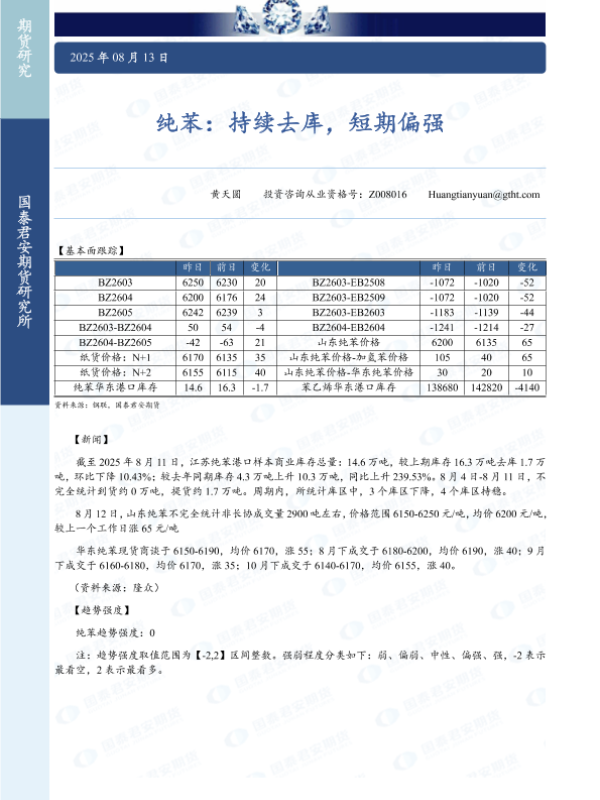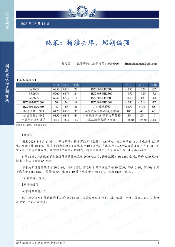 【国泰君安期货】【20250813】纯苯:持续去库,短期偏强-2页