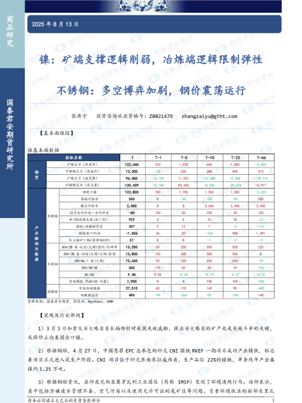 【国泰君安期货】【20250813】镍:矿端支撑逻辑削弱,冶炼端逻辑限制弹性,不锈钢:多空博弈加剧,钢价震荡运行-3页