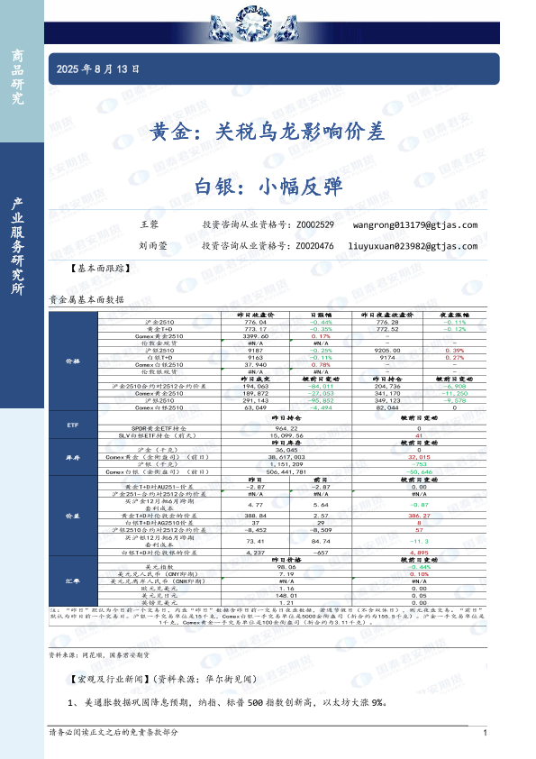 【国泰君安期货】【20250813】黄金_关税乌龙影响价差_白银_小幅反弹-3页