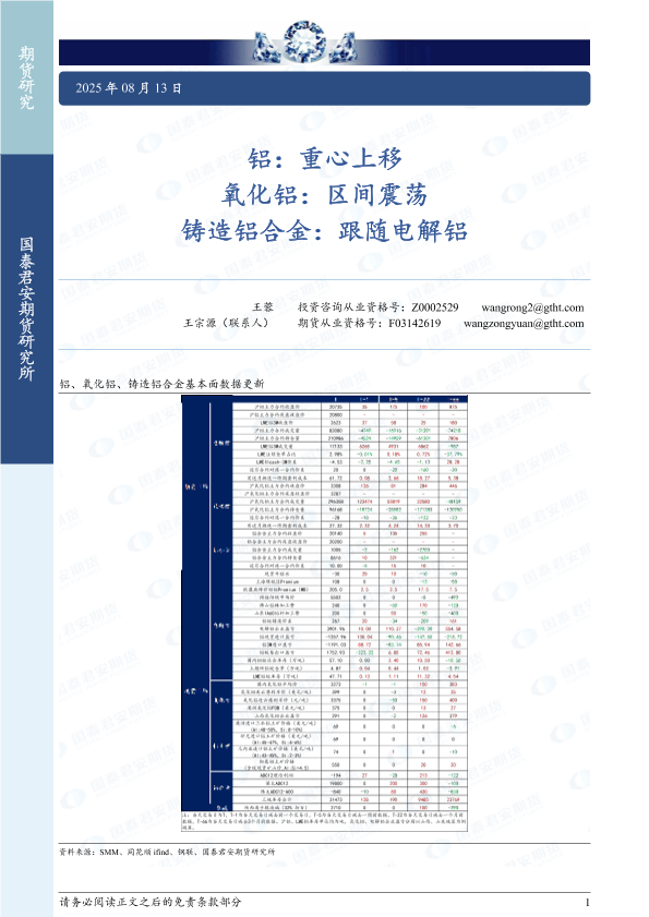 【国泰君安期货】【20250813】铝:重心上移 氧化铝:区间震荡 铸造铝合金:跟随电解铝-3页