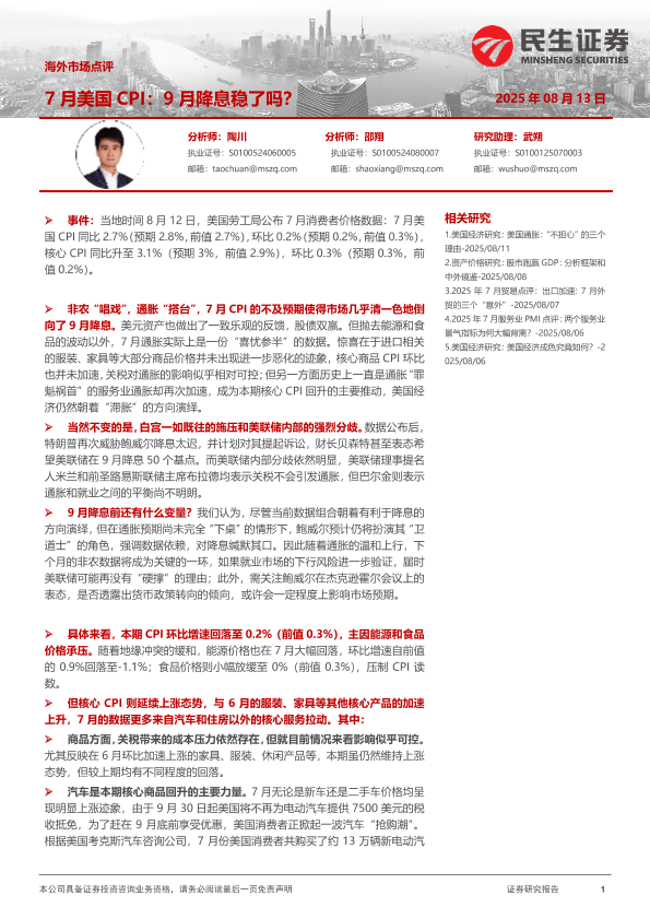 【民生证券】【20250813】7月美国CPI:9月降息稳了吗?-7页