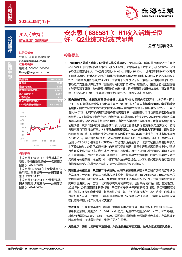 【东海证券】【20250813】安杰思(688581):H1收入端增长良好,Q2业绩环比改善显著-4页