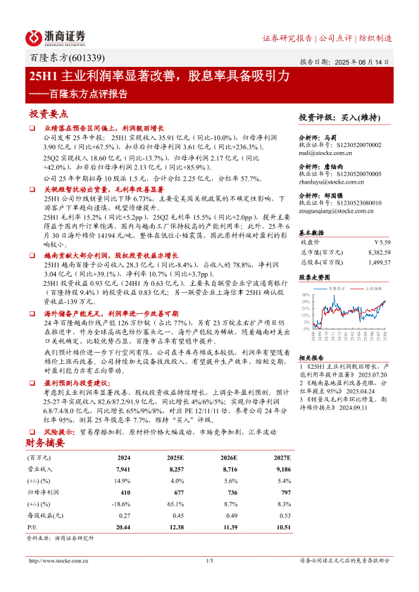 【浙商证券】【20250814】25H1主业利润率显著改善,股息率具备吸引力——百隆东方点评报告-3页