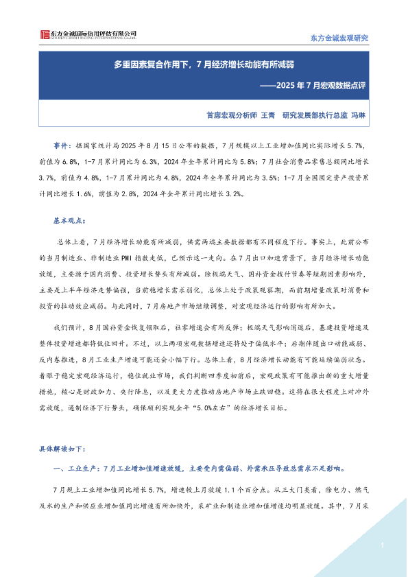 【东方金诚】【20250815】2025年7月宏观数据点评:多重因素复合作用下7月经济增长动能有所减弱-5页