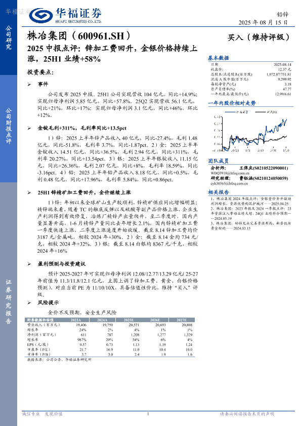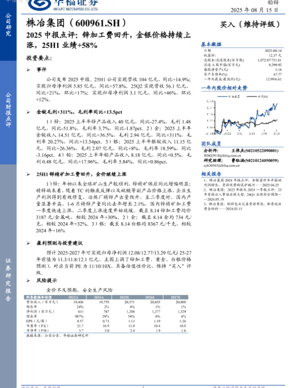 【华福证券】【20250815】2025中报点评:锌加工费回升,金银价格持续上涨-3页