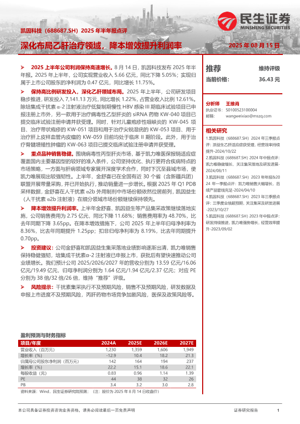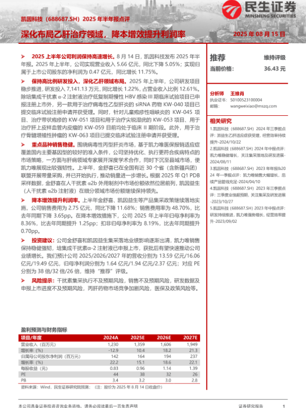【民生证券】【20250815】凯因科技2025年半年报点评:深化布局乙肝治疗领域,降本增效提升利润率-3页