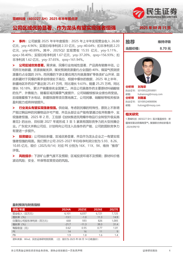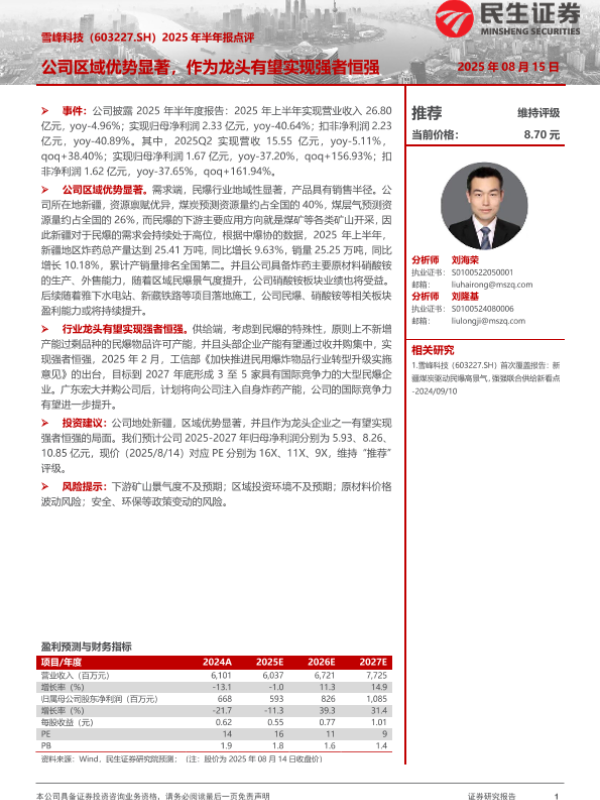 行业龙头 区域优势 新疆资源 盈利能力 民爆行业