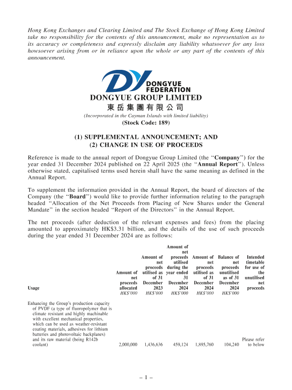 【Dongyue Group Limited】【20250804】DONGYUE GROUP LIMITED (1) SUPPLEMENTAL ANNOUNCEMENT; AND (2) CHANGE IN USE OF PROCEEDS-3页