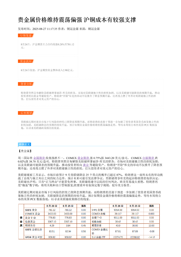 【铜冠金源期货】【20250827】贵金属价格维持震荡偏强 沪铜成本有较强支撑-2页