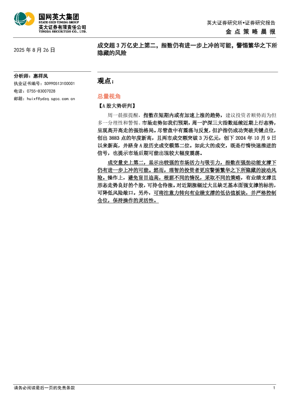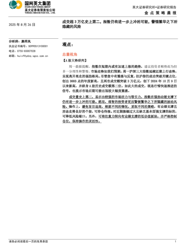 【英大证券】【20250826】金点策略晨报-成交超3万亿史上第二,指数仍有进一步上冲的可能,警惕繁华之下所隐藏的风险-4页