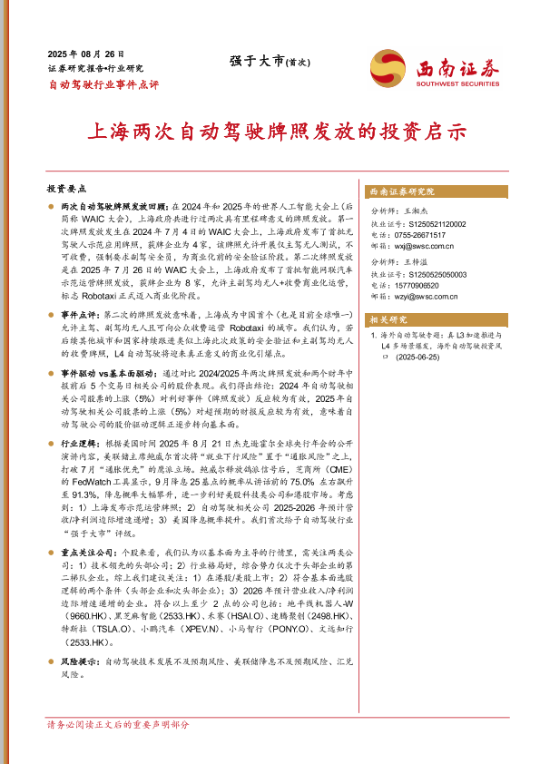 【西南证券】【20250826】自动驾驶行业事件点评-上海两次自动驾驶牌照发放的投资启示-12页
