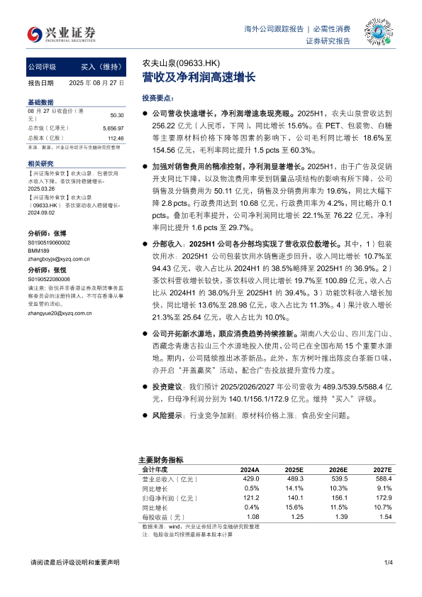【兴业证券】【20250827】农夫山泉-营收及净利润高速增长-4页