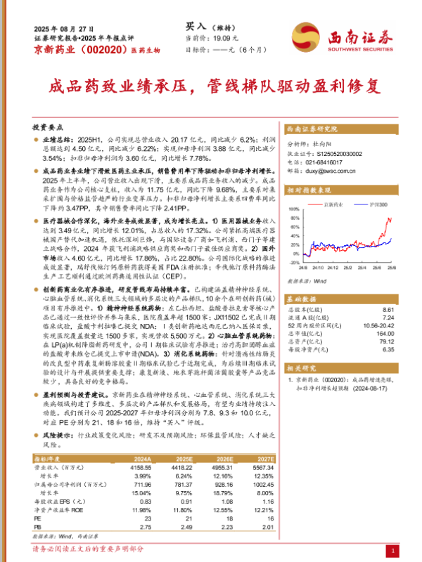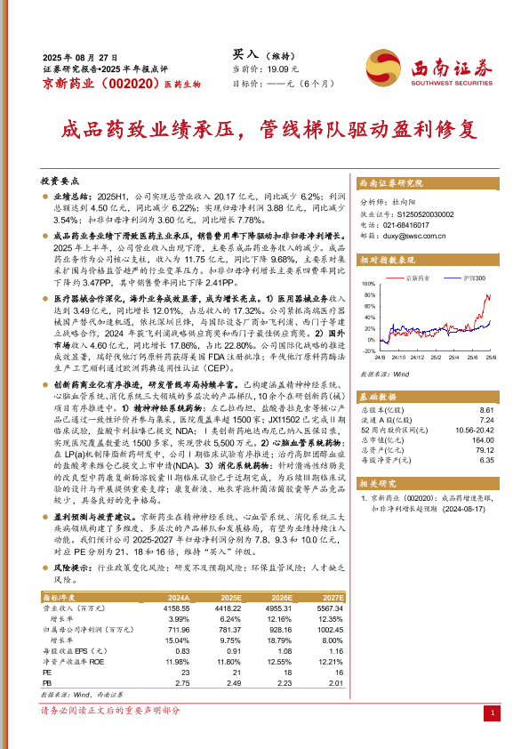 【西南证券】【20250827】京新药业-成品药致业绩承压,管线梯队驱动盈利修复-6页