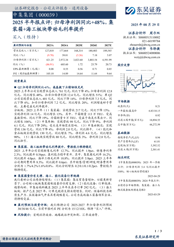 【东吴证券】【20250829】中集集团-2025半年报点评:归母净利润同比+48%,集装箱+海工板块带动毛利率提升-3页