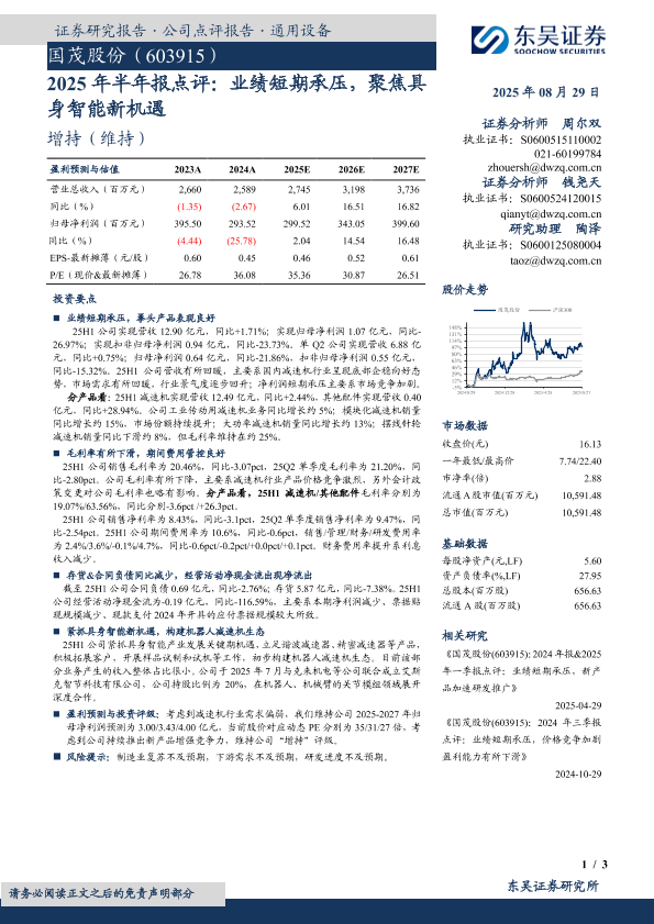 【东吴证券】【20250829】国茂股份-2025年半年报点评:业绩短期承压,聚焦具身智能新机遇-3页
