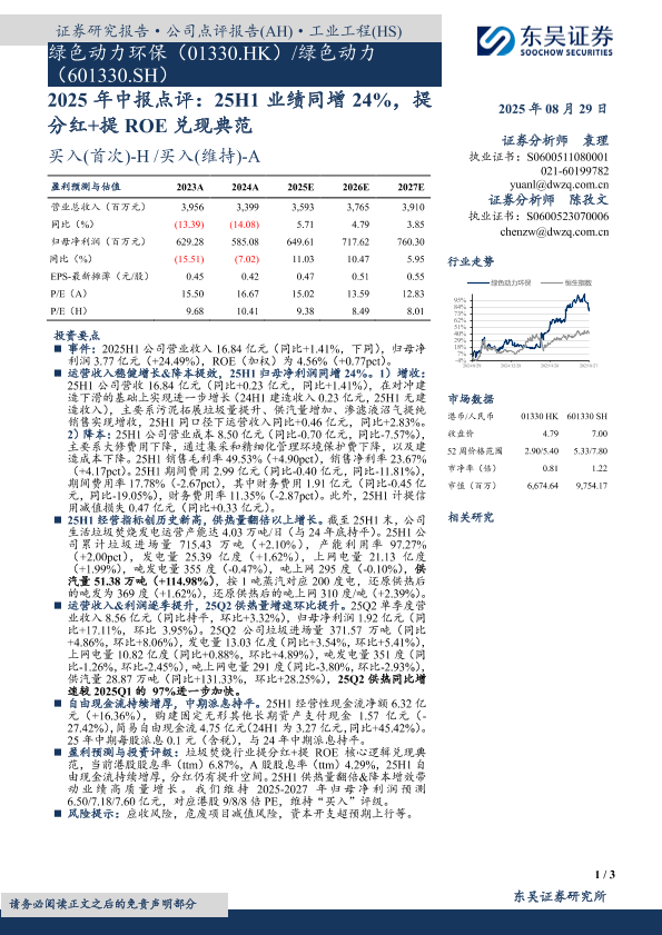 【东吴证券】【20250829】绿色动力环保-2025年中报点评:25H1业绩同增24%,提分红+提ROE兑现典范-3页