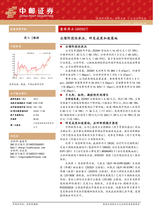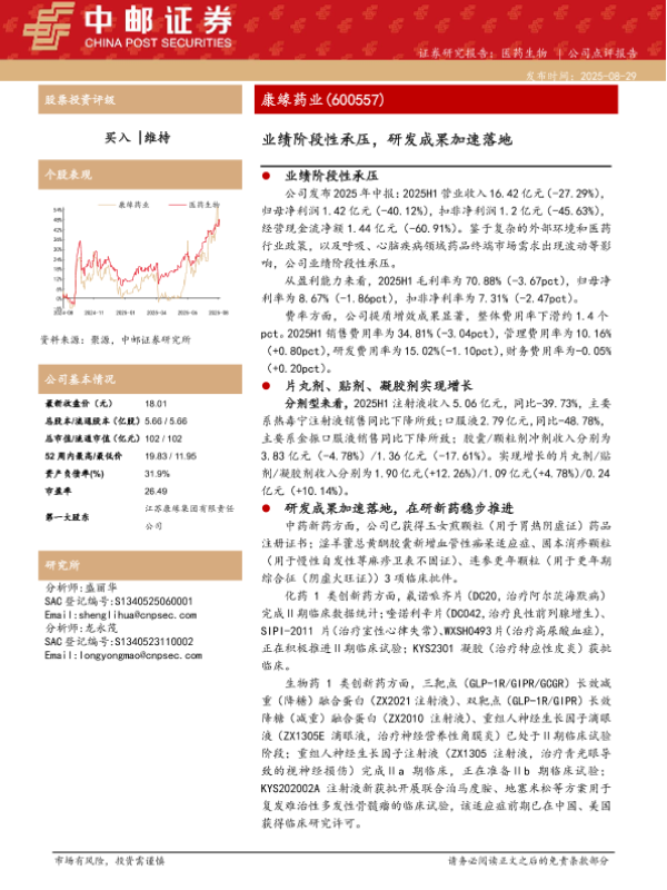 【中邮证券】【20250829】康缘药业-业绩阶段性承压,研发成果加速落地-5页