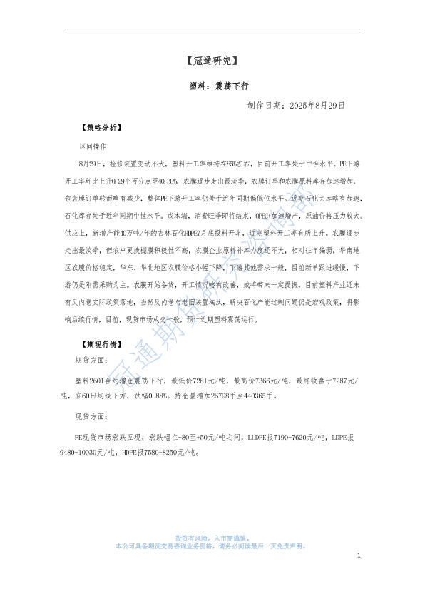 【冠通期货】【20250829】塑料-震荡下行-3页