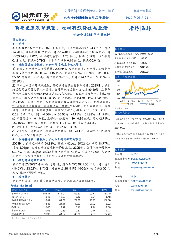 【国元证券】【20250829】味知香-商超渠道表现靓丽,原材料涨价扰动业绩-3页