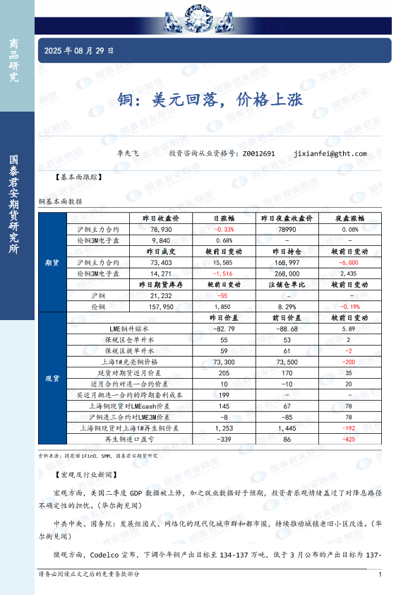 【国泰君安期货】【20250829】铜-美元回落,价格上涨-3页