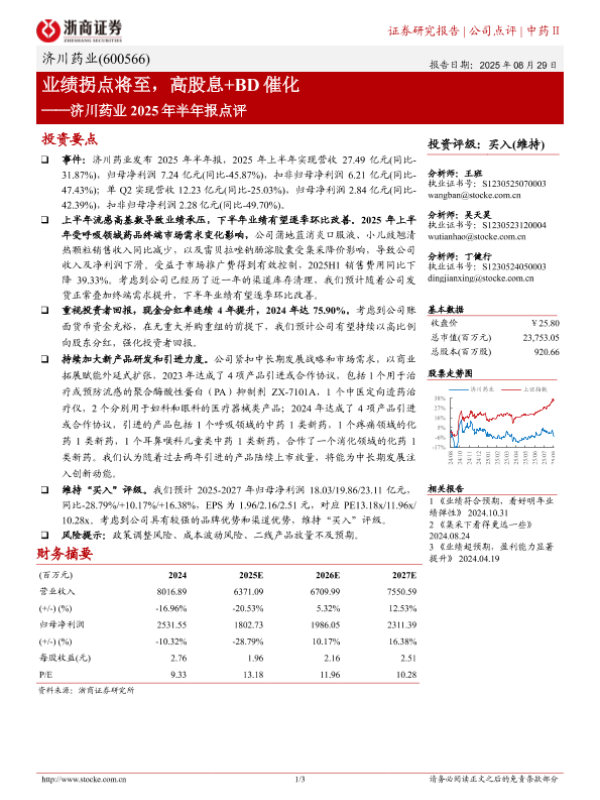 【浙商证券】【20250829】济川药业-济川药业2025年半年报点评_业绩拐点将至_高股息+BD催化-3页