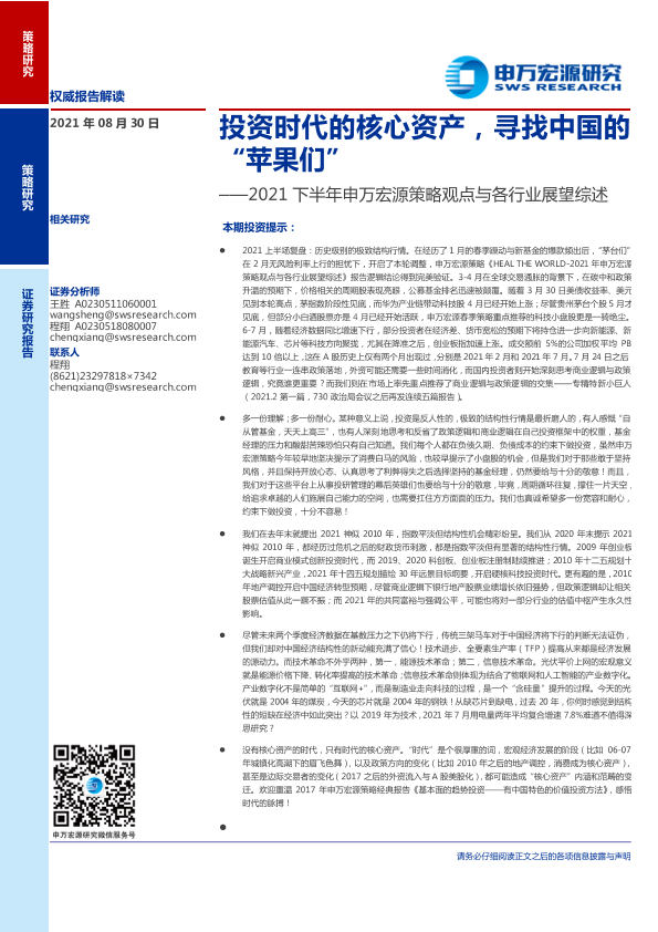 【申万宏源】【20210830】2021下半年申万宏源策略观点与各行业展望综述:投资时代的核心资产,寻找中国的“苹果们”-22页