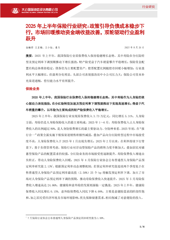 【大公国际资信评估有限公司】【202508】2025年上半年保险行业研究:政策引导负债成本稳步下行,市场回暖推动资金端收益改善,双轮驱动行业盈利跃升-6页