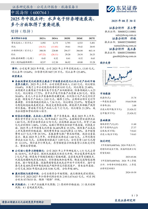 【东吴证券】【20250830】中国海防-2025年中报点评:水声电子防务增速最高,多个方面取得了重要进展-3页