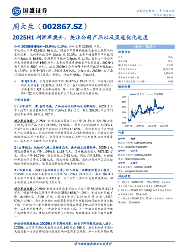 【周大生(002867.SZ)】【20250830】周大生-2025H1利润率提升,关注公司产品以及渠道优化进度-4页