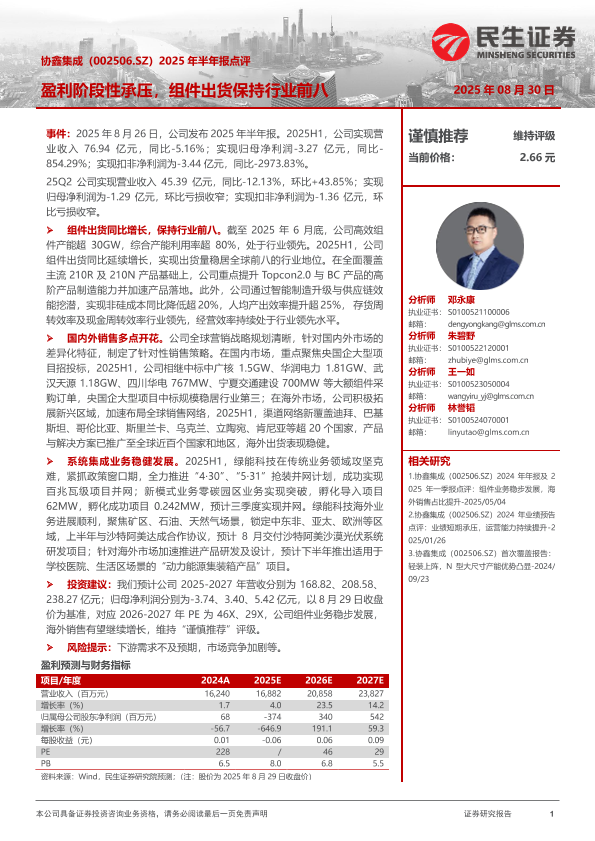 【民生证券】【20250830】协鑫集成-2025年半年报点评_盈利阶段性承压_组件出货保持行业前八-3页