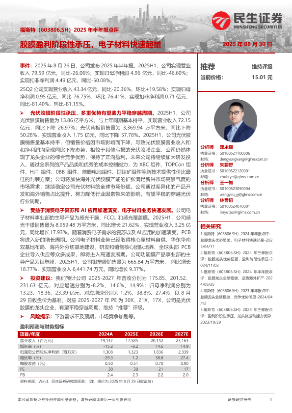 【民生证券】【20250830】福斯特-2025年半年报点评_胶膜盈利阶段性承压_电子材料快速起量-3页
