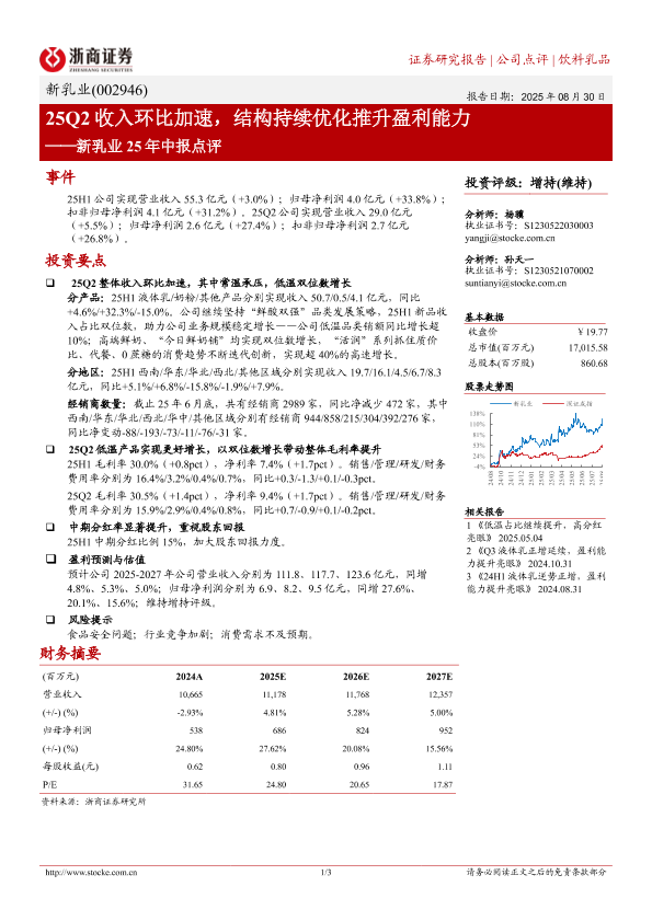 【浙商证券】【20250830】新乳业-25Q2收入环比加速,结构持续优化推升盈利能力-3页