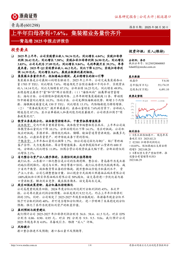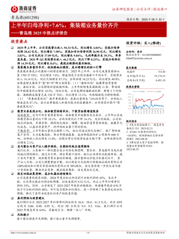 【浙商证券】【20250830】青岛港-上半年归母净利+7.6%,集装箱业务量价齐升-4页