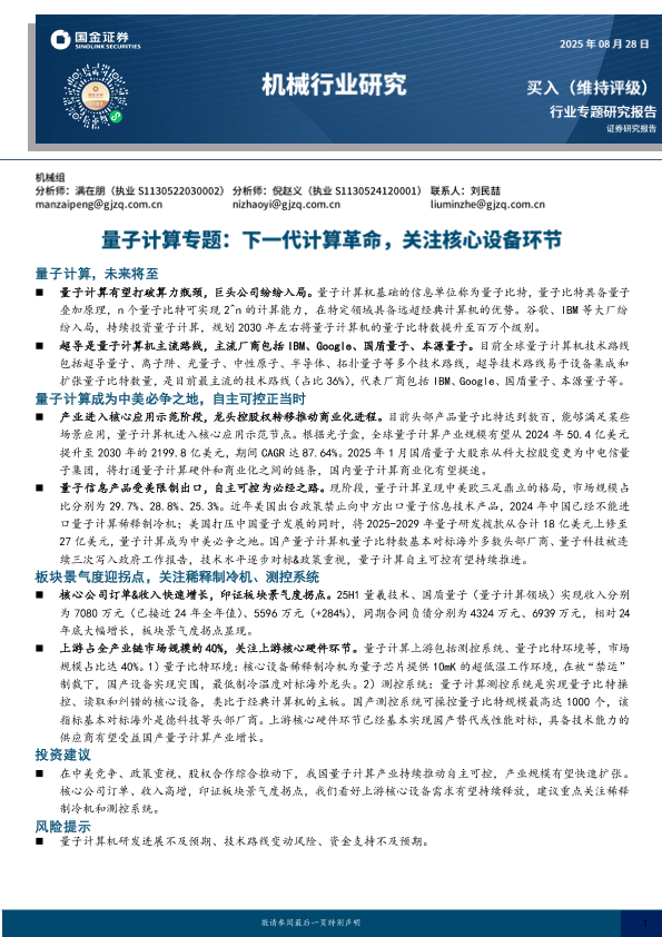 机械行业 测控系统 量子计算 自主可控 稀释制冷机