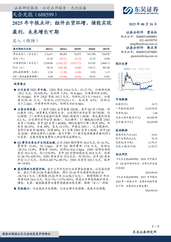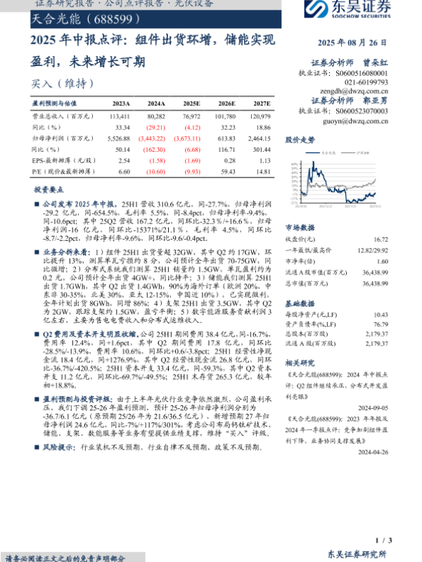 【东吴证券】【20250826】天合光能-2025年中报点评:组件出货环增,储能实现盈利,未来增长可期-3页