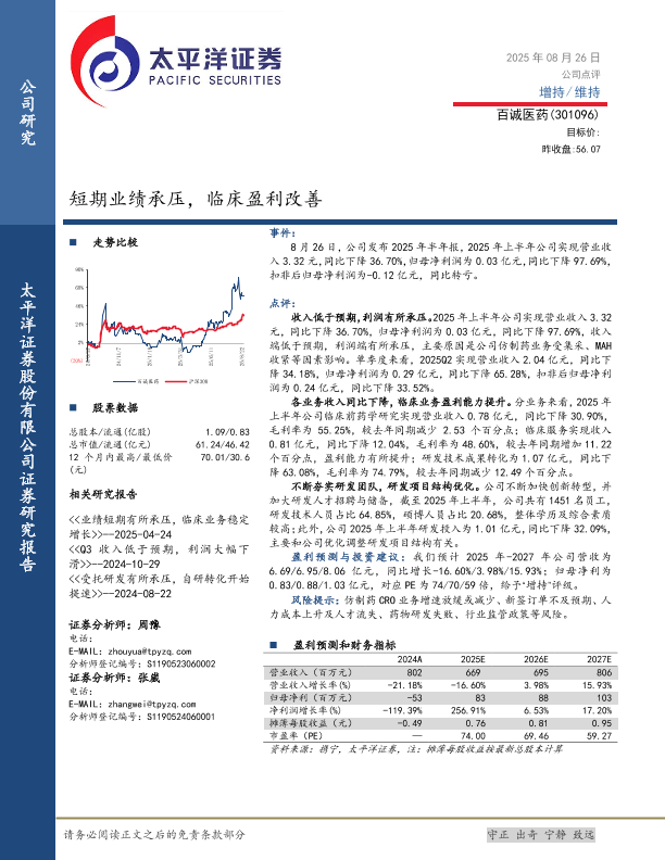 【太平洋证券股份有限公司证券研究报告】【20250826】百诚医药-短期业绩承压_临床盈利改善-4页