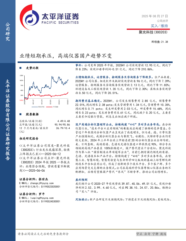 【太平洋证券股份有限公司证券研究报告】【20250827】聚光科技(300203)-业绩短期承压-高端仪器国产趋势不变-5页