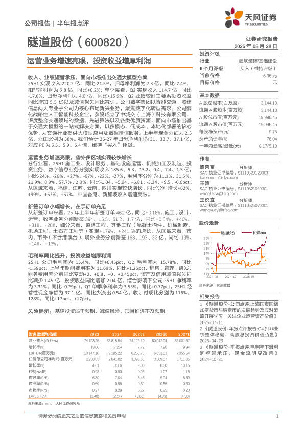 【天风证券】【20250828】隧道股份-运营业务增速亮眼-投资收益增厚利润-3页