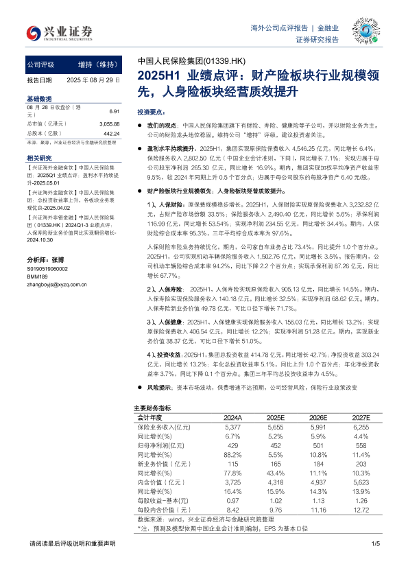 【兴业证券】【20250829】中国人民保险集团-2025H1业绩点评:财产险板块行业规模领先,人身险板块经营质效提升-5页