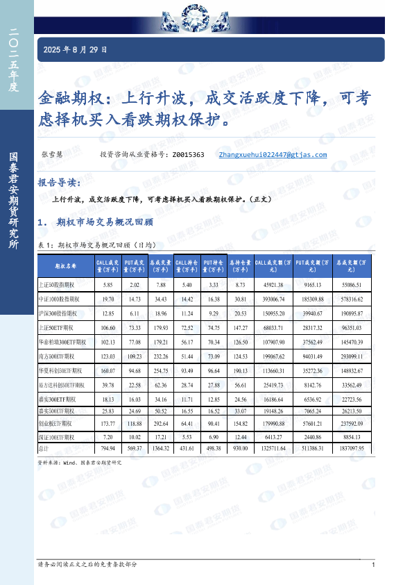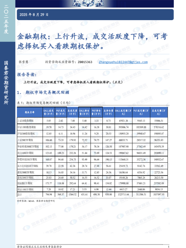 【张雪慧】【20250829】金融期权:上行升波,成交活跃度下降,可考虑择机买入看跌期权保护-16页