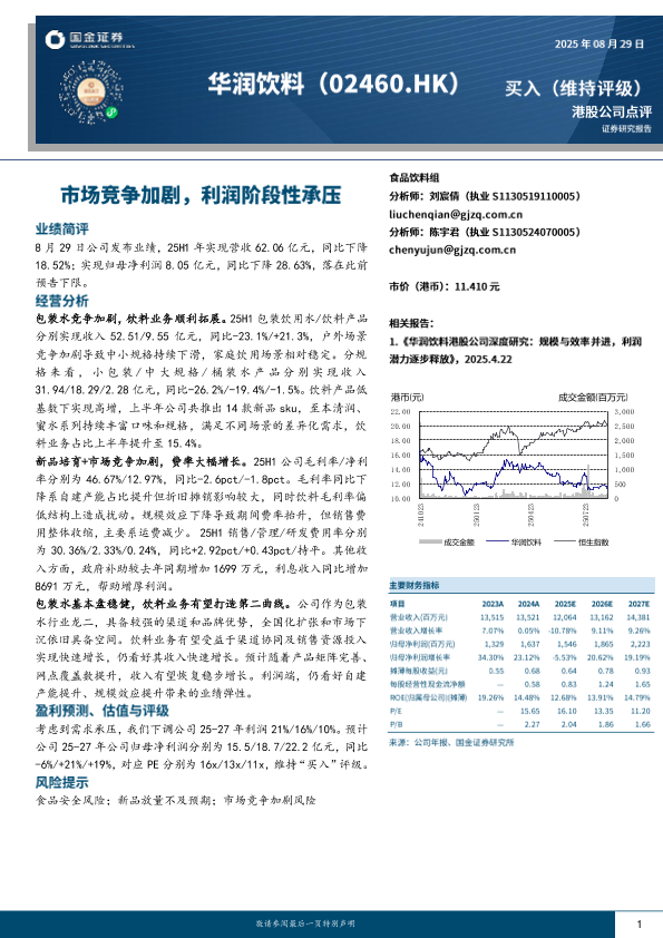 【刘盛倩(执业S1130519110005)陈宇君(执业S1130524070005)】【20250829】华润饮料-市场竞争加剧_利润阶段性承压-4页