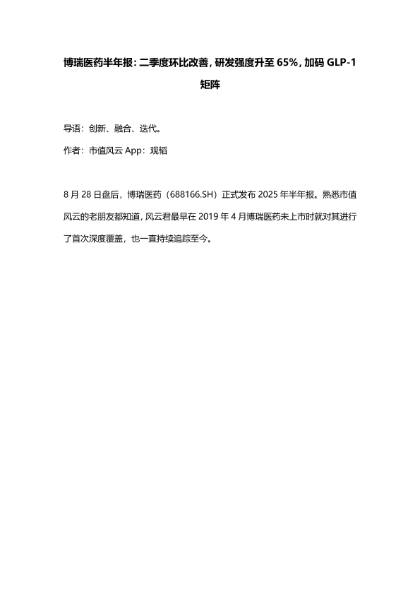 【市值风云 App 观韬】【20250829】博瑞医药-半年报:二季度环比改善,研发强度升至65%,加码GLP-1矩阵-13页