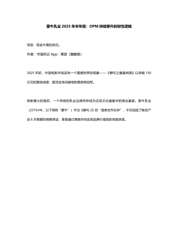 【市值风云 App 萧瑟(魏鲲昊)】【20250829】蒙牛乳业-蒙牛乳业2025年半年报_OPM持续攀升的韧性逻辑-14页